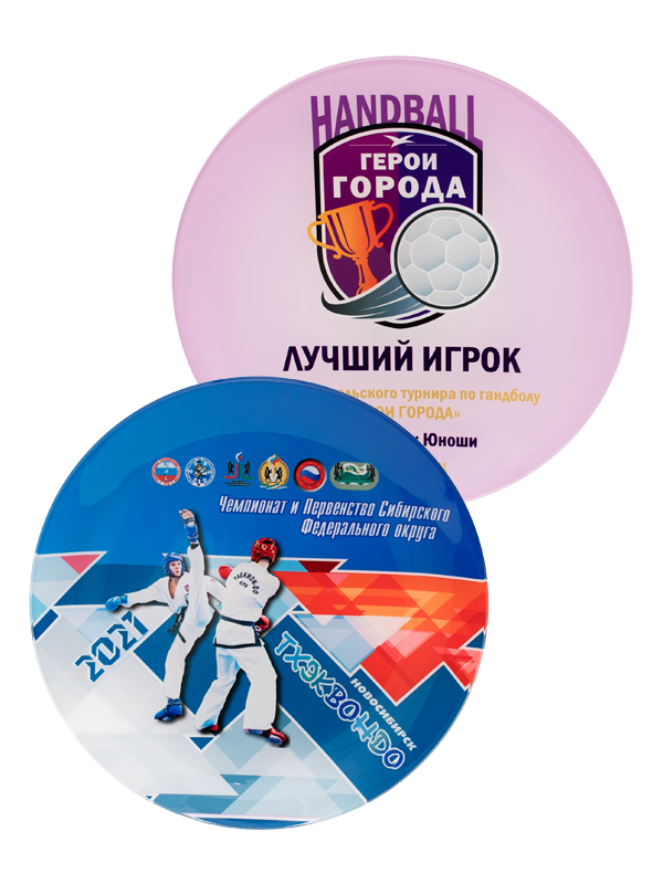 Актуальным подарком гостям, участникам праздника, спортивного соревнования может стать специальная наградная тарелка. Это компактный и изящный атрибут, на котором можно красочно запечатлеть символику, название, дату и другие значимые для повода элементы.
