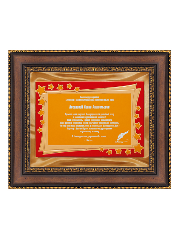 Особое место занимают наградные плакетки, изготовленные из качественных материалов и содержащие информацию о заслугах виновника торжества. Текст и дизайн согласовывается при обработке заказа, гравировка производится на специальной металлической или пластиковой пластине, укрепленной на деревянной основе. Наградные доски могут быть снабжены необходимой символикой, украшены декоративной рамкой.