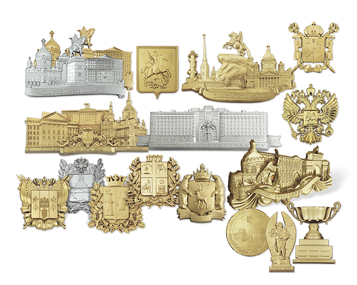 Объединение «Диалог-Конверсия» изготовит объемные накладки методом литья с покрытием золотого или серебряного цвета. Накладки могут содержать символику и достопримечательности Вашего региона, различные здания и логотипы, изображения людей, животных и многое другое. Срок изготовления – 1 месяц.