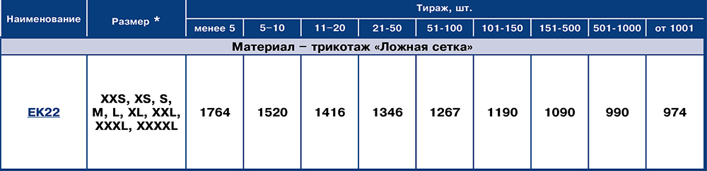 | EK22-XXL | Трикотаж «ложная сетка» | Полное запечатывание с двух сторон | .CDR | 0 руб. | ||
