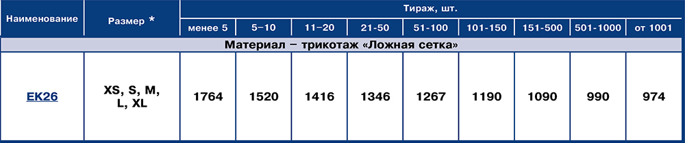 | EK26-XL | Трикотаж «ложная сетка» | Полное запечатывание с двух сторон | 0 руб. | ||